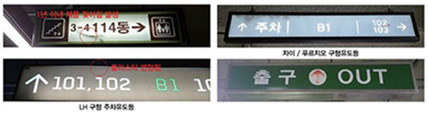 주차장 내부의 입·출구 안내 표시를 하여 안전운행과 신속하고 원활한 차량소통이 되도록 안내 유도하여
